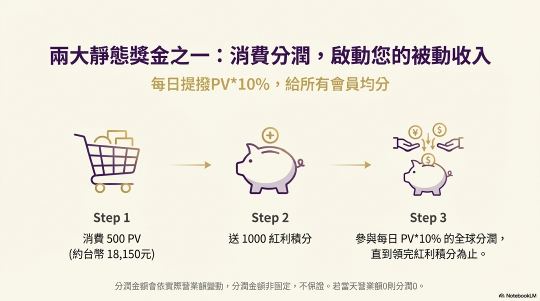 靜態獎金:每日提撥10%PV,讓消費回饋給你