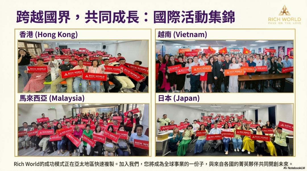 Rich World的成功模式正在亞太地區快速複製。加入我們,您將成為全球事業的一份子,與來自各國的菁英夥伴共同開創未來。