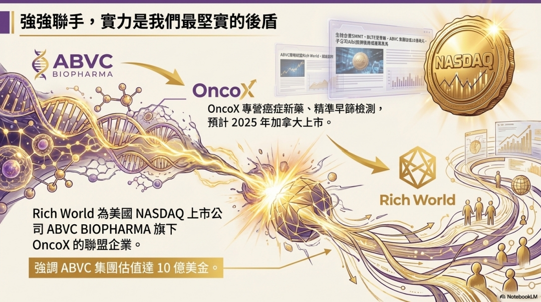 Rich World 為美國 NASDAO 上市公 司 ABVC BIOPHARMA 旗下 OncoX的聯盟企業。