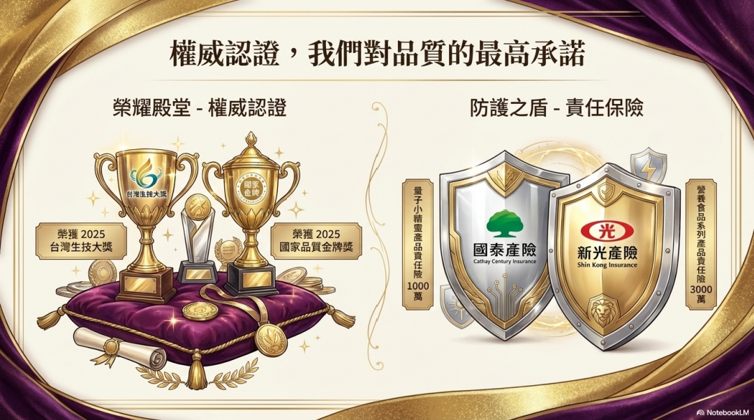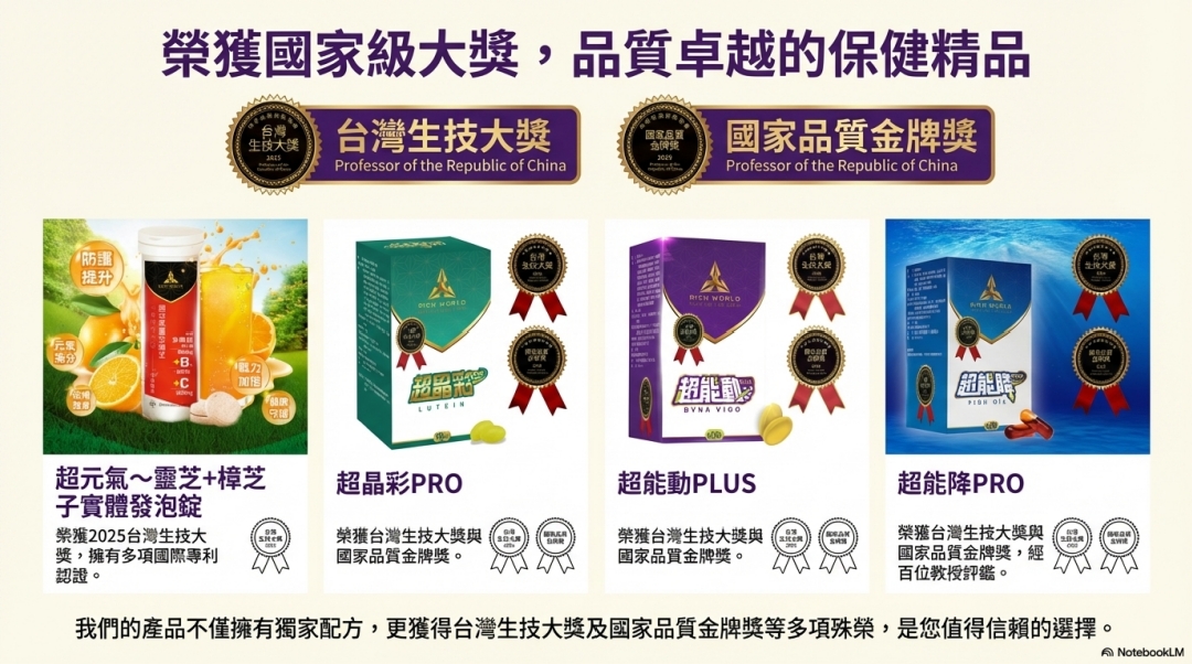 我們的產品不僅擁有獨家配方,更獲得台灣生技大獎及國家品質金牌獎等多項殊榮,是您值得信賴的選擇。